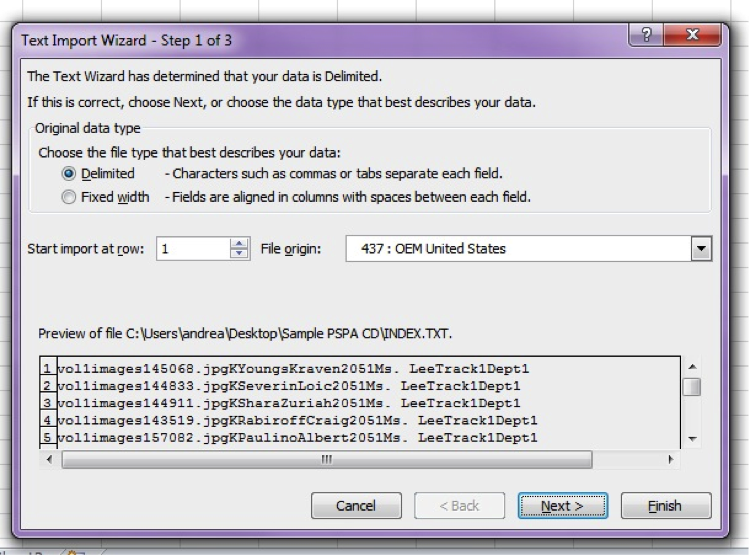 When you first open up INDEX.TXT through Microsoft Excel, you may receive a prompt warning you that your text is Delimited. Delimited data means that fields are separated by commas or tabs, and we want to preserve this when we import it into Excel. These tabs help Creator Studio(TM) determine which fields are separate. You can follow the prompts below for an example (generally the default values are fine):