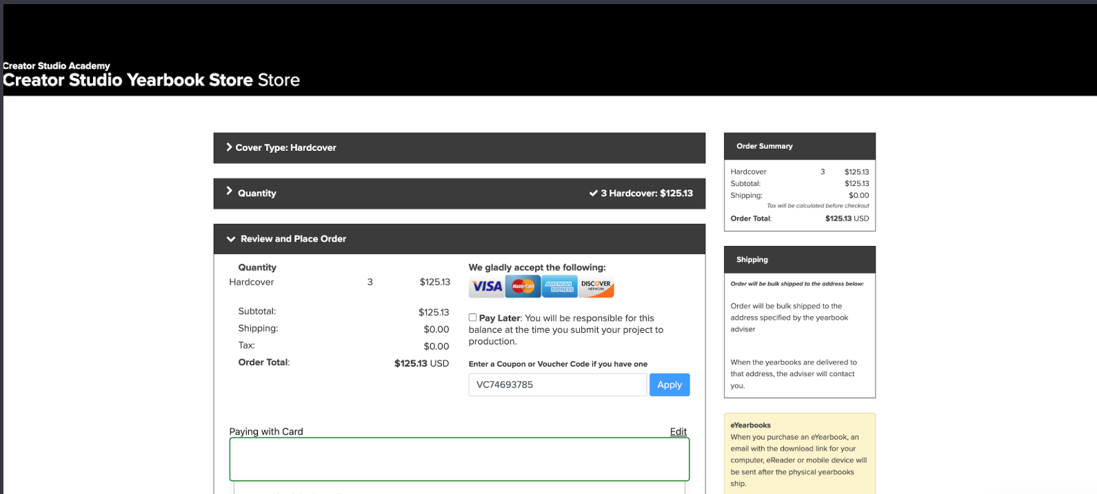 Make sure all sections of your yearbook are locked. Next, go to your school’s online storefront and login with your Creator Studio account. Then click on the “Order in Bulk” button.