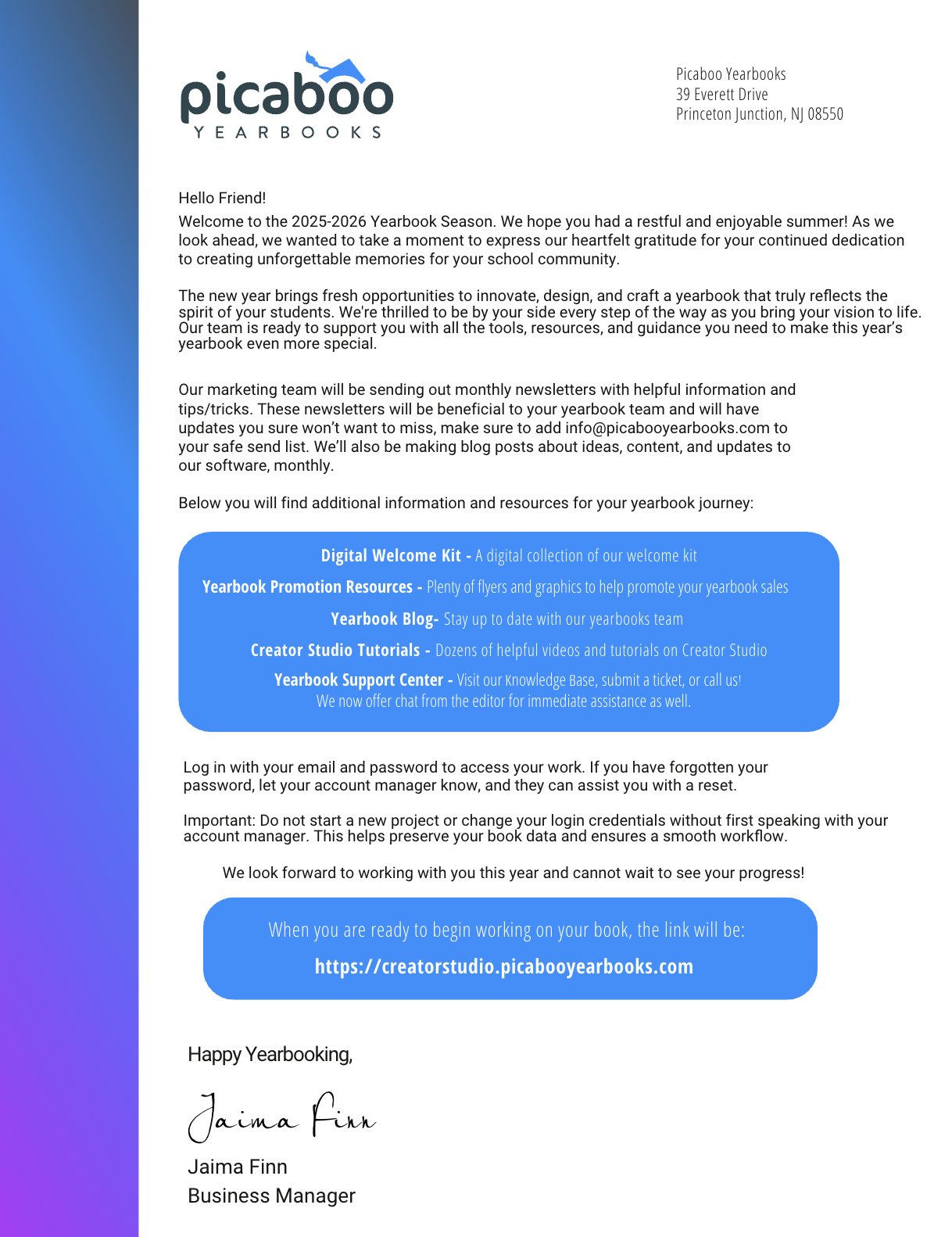 Welcome to the 2025-2026 school year. We are so glad you are here and can’t wait to get started on your yearbook journey. Below you’ll find various tools and resources to get started with your yearbook program. If you would like a physical yearbook welcome kit mailed, please reach out to your account manager.